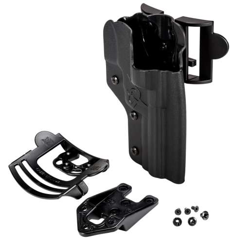 Belt Mount – The belt mount is the most popular mounting option among competition shooters. This mount provides a secure fitment designed to cater to comfortability on the user’s hip. The belt mount will accommodate belts from 1.5” to 2.25”. The belt width compatibility can easily be adjusted by unscrewing and removing the belt adjustment bar and reinserting it in the correct slot or removing the bar for 2.25” belts.