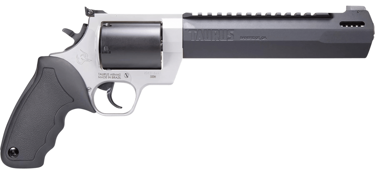 The Raging Hunter in a 500 Magnum. The 500 Magnum Raging Hunter features custom barrel ports to help reduce the recoil of 500 Magnum; target crown barrel enhances accuracy for precise shots; top Picatinny rail for mounting optics and accessories; unfluted cylinder increases weight and helps reduce recoil; cushioned grip provides maximum surface contact area and the Taurus double lock system keeps the cylinder secure when firing the heaviest of magnums.